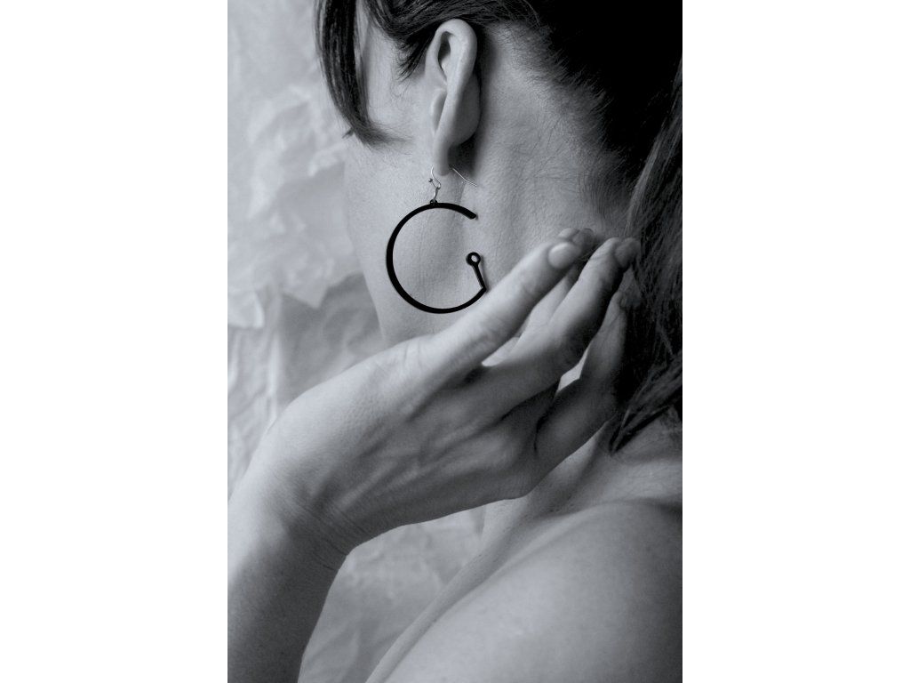 Náušnice ve tvaru kruhu s písmenkem nakonci.